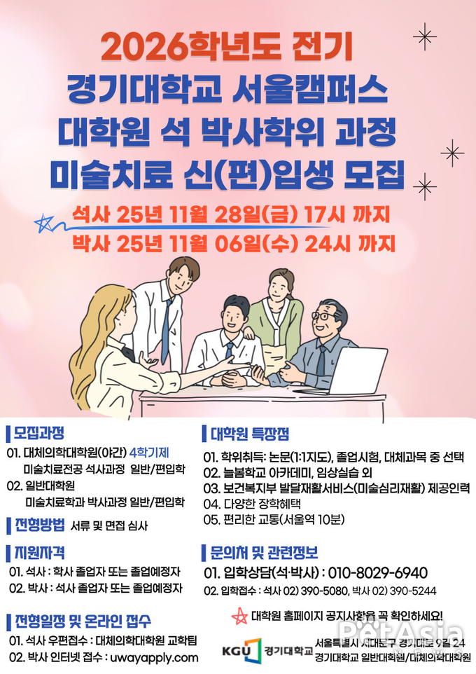 관련 문의는 석·박사 입학상담 대표번호(010-8029-6940)를 비롯해 석사과정은 02-390-5080, 박사과정은 02-390-5244로 가능하다. 자세한 내용은 경기대학교 대학원 홈페이지 공지사항을 통해 확인할 수 있다.
