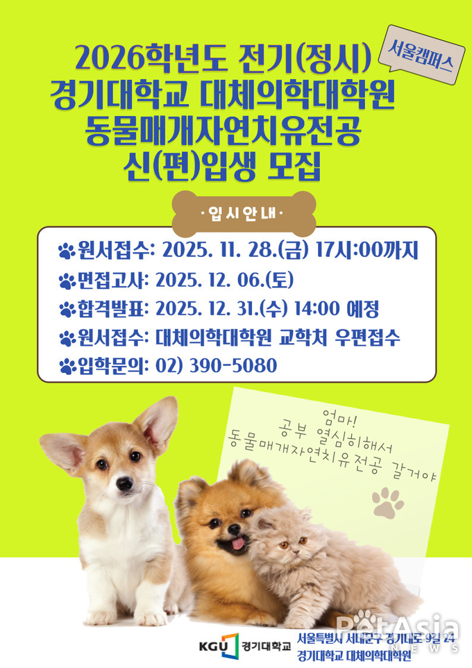 서울캠퍼스에 위치한 경기대학교 대체의학대학원이 2026학년도 전기(정시) ‘동물매개자연치유전공’ 신(편)입생을 모집한다. 이번 모집은 동물과 인간의 교감을 통해 심리적 안정과 정서적 치유를 실현하는 전문 인력 양성을 목표로 하고 있다. ‘동물매개자연치유전공’은 반려동물·치유동물과의 상호작용을 통해 우울·불안·스트레스·사회적 고립 등의 문제를 완화하는 자연치유 기반 대체의학 분야다.